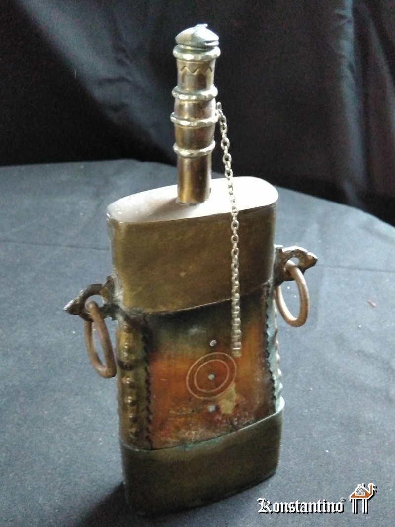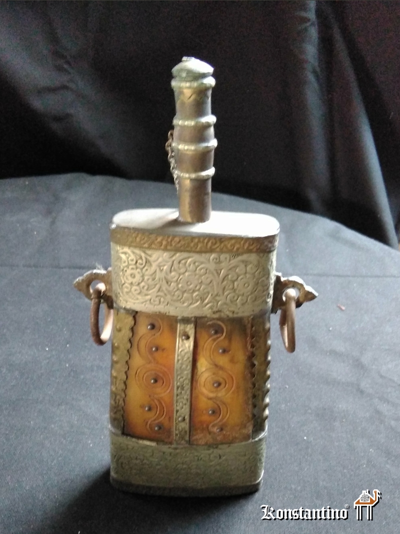 Precioso recipiente de pólvora marroquí del S.XIX con muy fino trabajo en madera y metal. Presenta bonita pátina de uso